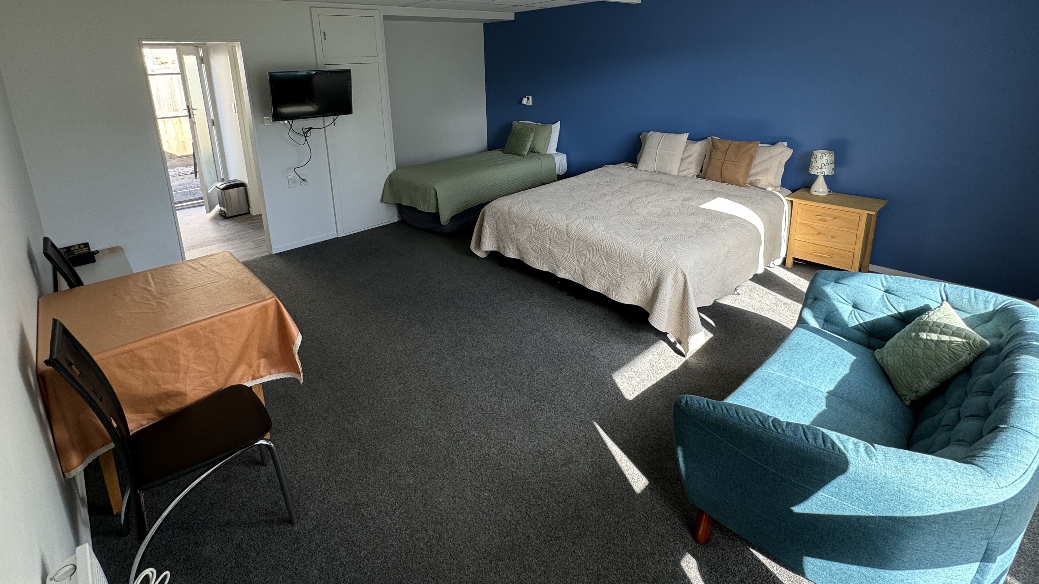 We offer 4 very spacious and quiet 2 bedroom family units. Our Family units have a king bed (which can be split into 2 singles by prior arrangement) in 1 bedroom and 2 single beds in the 2nd bedroom, some of our family units also have a sofa bed in the living room for the 5th guest. They have full kitchen facilities with oven & microwaves, ensuite bathrooms with shower.